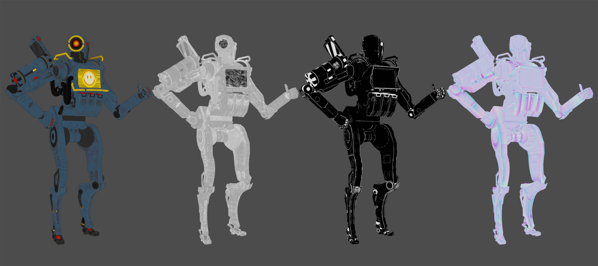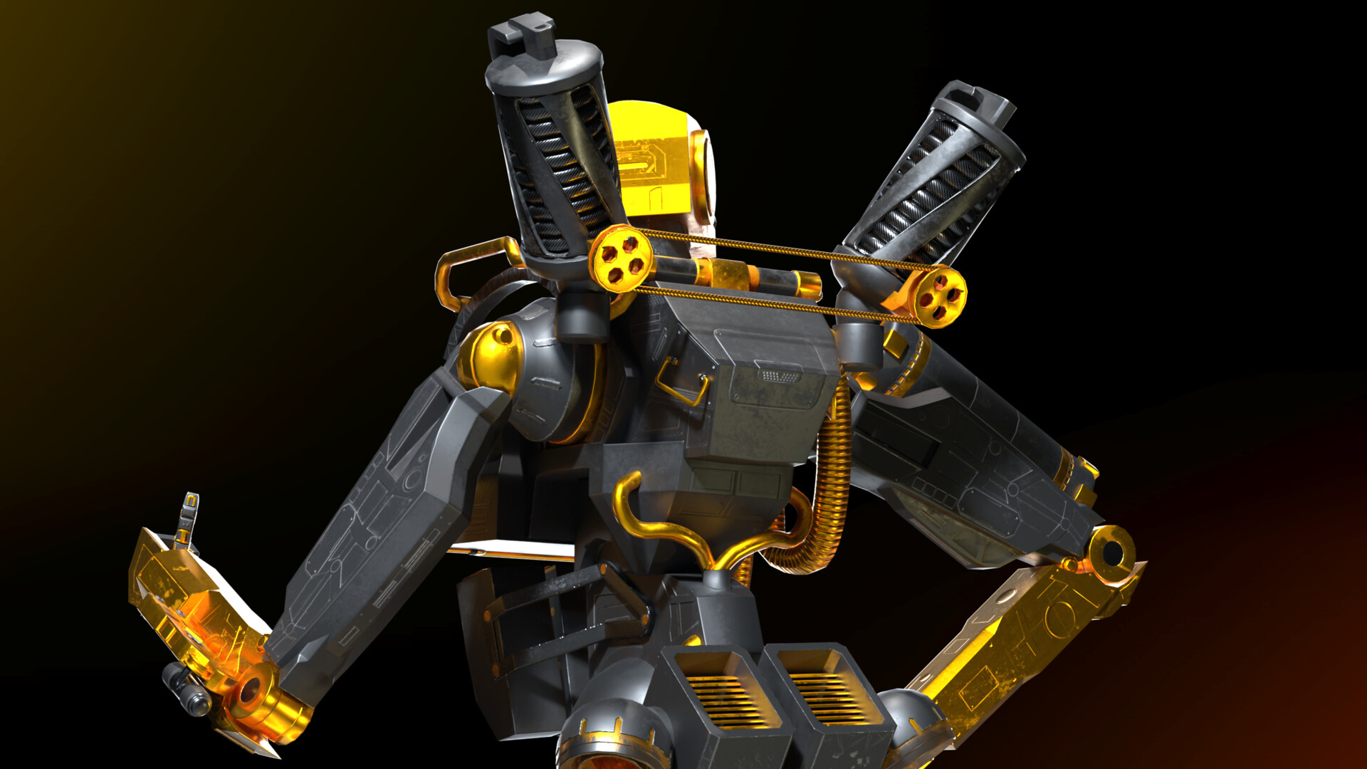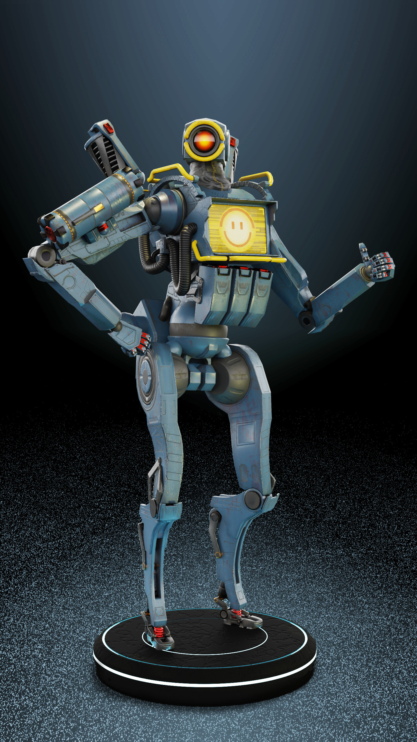 Explore my imaginative take on the Apex Legends character, Pathfinder, with not one, but two distinct versions: the classic blue rendition and my personally designed golden-black skin. Crafted in Blender and textured using Substance Painter, these 3D models showcase my creative flair, incorporating unique shapes and modifications while maintaining game-ready functionality. For added diversity, I implemented a simple rig enabling dynamic poses for renders. The intentional departure from a direct replica of the original Pathfinder results in a robot with a slightly thicker build, adding a touch of personality to the design.